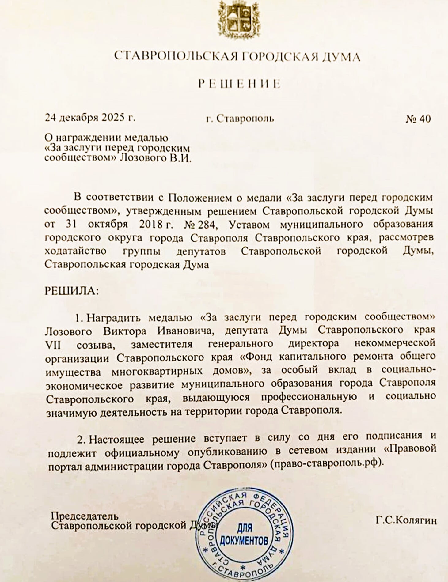 24 декабря 2025 года решением Ставропольской городской Думы председатель Ставропольского краевого регионального отделения «Российского Совета ветеранов пограничной службы», депутат Думы Ставропольского края Виктор Иванович Лозовой удостоен медали «За заслуги перед городским сообществом.
